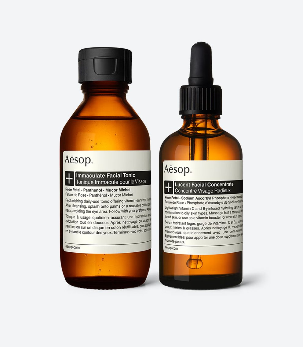 An exfoliating tonic and a hydrating serum to refine, balance and replenish the skin.